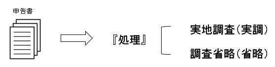税務署内では、上記1を「実地調査」(略称「実調(じっちょう)」)、上記2を「調査省略」(略称「省略」)と呼んでいます。